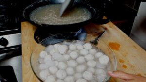 เดี๋ยวก็กลมเองค่ะ ตาทำก็ไม่ได้กลมมาก พอกลม ๆ ก็เอาช้อนชุ่มน้ำ มาปาด ใส่ลงไปในหม้อน้ำร้อน