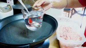 20.อีกอย่างเตรียมช้อนที่จะปาดลูกชิ้น ใส่น้ำไว้แก้วหนึงด้วยค่ะ