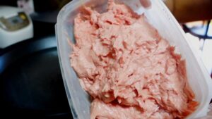 11.เนื้อเอาออกมาจากแช่ช่องแข็ง ประมาณ 1 ชั่วโมง ใส่อ่างผสม ถ้าไม่มีเครื่องผสมก็ใส่อ่างใหญ่ ๆ ค่ะ