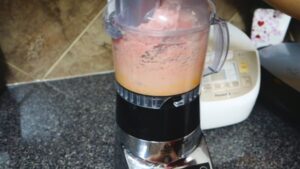 16.ปั่น เวลาปั่นให้ใส่น้ำแข็งก้อนละเอียดลงไปด้วยทำให้เนื้อเย็นจัดอยู่ค่ะ ปั่นให้ได้เนื้อเนียน ๆ ยิ่งเนียนยิ่งดีค่ะ