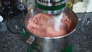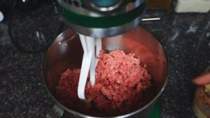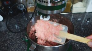 13.พอส่วนผสมเข้ากันได้ดี ก็เร่งเป็นเบอร์แรง 9 หรือ 10 เลยค่ะ ปั่นให้เนื้อเข้ากันกับเครื่องปรุง แล้วให้เนื้อเหนียวด้วยค่ะ ปั่นไปซัก 10 นาทีค่ะ