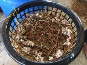 2.จากนั้น นำฟางเรียงก้นตะกร้า (ปูพื้น) โรยด้วยวัสดุเพาะเห็ดชนิดอื่นๆ ที่ผ่านการเพาะมาแล้วและตามด้วยหั ว เ ชื้ อเห็ดฟาง (วัสดุเพาะเห็ดชนิดอื่นๆ ที่ผ่านการเพาะมาแล้วและหั วเ ชื้ อ โรยขอบตะกร้า เพื่อให้ด อ กเห็ดออกตามขอบตะกร้า เป็นชั้นๆ ขึ้นมา)