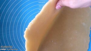 • นำแป้งพายออกจากตู้เย็นแล้วนวด ประมาณ 1-2 นาที พอตะล่อม ๆ ให้แป้งเข้ากัน แล้วแบ่งแป้งเป็น 2 ส่วน คือ 70:30 แป้งก้อนใหญ่ใช้ทำ