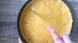 • ใช้มีดกรีดหน้าขนมตามรอยที่เราจะตัด เพื่อให้ขนมมีช่องระบายอากาศตอนอบ (ไม่ต้องกรีดจนขาดนะ แค่พอมีช่องระบายพอ) นำไปอบที่