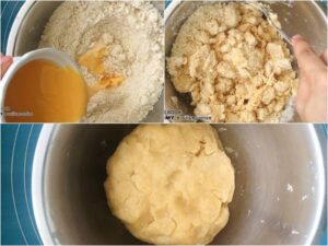 • ค่อย ๆ เทส่วนผสมไข่แดงลงในส่วนผสมแป้ง ใช้ส้อมที่ตีไข่ตะล่อม ๆ ให้แป้งจับกันเป็นก้อน แค่ตะล่อม ๆ กดเบา ๆ นะคะ ไม่ต้องนวดเพราะแป้งจะเหนียวเกินไป