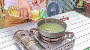 12.นำกระทะตั้งไฟปานกลางใส่น้ำมันรอให้ร้อนก่อน