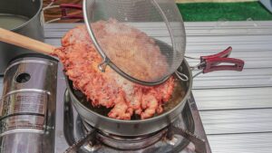 4.เอากระชอนตักเส้นมาม่าขึ้นจากหม้อ