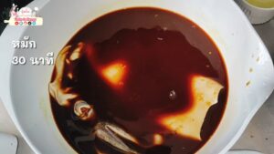 (ทำเยอะนิดนึงนะคะ เพราะว่า ใช้ปลาหมึกตัวใหญ่ ไซส์ 1 กิโลกรัม)7.เอาปลาหมึกไปแช่ หมักทิ้งไว้ 30 นาทีค่ะ