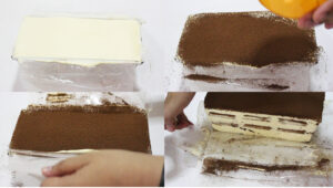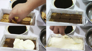 ชั้นแรก จุ่มบิสกิตกับน้ำกาแฟวางซ้อนกันสัก 2-3 ชั้น