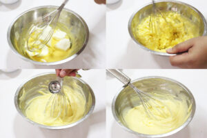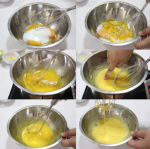 2.ตีไข่แดงกับน้ำตาลทรายบนหม้อน้ำร้อน อังไอน้ำ ตีจนอุณหภูมิไข่สูงขึ้นประมาณ 60-70 ํ C หรือลองเอานิ้วจุ่มดูมันจะอุ่นค่อนไปทางร้อน แล้วน้ำมาตีต่อข้างนอก จนไข่ฟูและสีขาวขึ้น เวลายกตะกร้อ ไข่จะไหลมาเป็นสาย พักให้เย็น