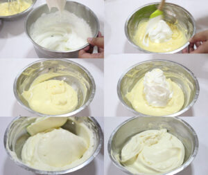 4.ตีวิปปิ้งครีม ตีให้ตั้งยอดกลางๆ ตักมาบางส่วนลงไปบางแล้วตะล่อมจนเข้ากัน พอเข้ากันก็ใส่ส่วนที่เหลือจนหมด แล้วตะล่อมให้เป็นเนื้อเดียวกัน