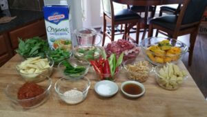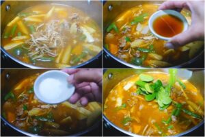 • พอเครื่องแกงเดือดก็นำเนื้อสับลงไปต้มเลยค่ะ ตานำเนื้อติดมันมาแกงนะคะ สับพอหยาบ ๆ ค่ะ ถ้าสับละเอียดไปก็ไม่ได้เคี้ยวสัมผัสเนื้อนะคะ ถ้าไม่กินเนื้อก็ใส่ไก่ หมู หรือลูกชิ้นปลาตอนนี้เลยค่ะ