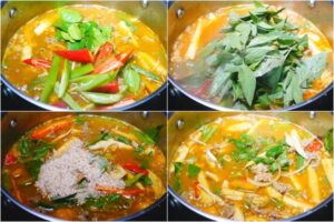 • นำหม้อใส่น้ำซุปไก่ผสมน้ำเปล่า หรือใช้น้ำเปล่าเพียว ๆ ก็ได้ค่ะ แต่ขอแนะนำใส่น้ำซุปด้วยจะได้รสชาติดีกว่าค่ะ เปิดเตา ตั้งน้ำซุปให้เดือด เอาน้ำพริกแกงป่าใส่ผสมกับน้ำซุปเลยค่ะ