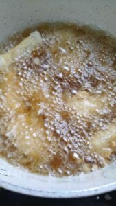 1. นำขนมเข่งหั่นชิ้นแช่ช่องแข็ง พอตัวขนมเย็นก็นำออกมาเตรียมทอด