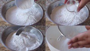2.ผสมแป้งข้าวเหนียว+แป้งท้าวยายม่อม+เกลือป่น คนให้เข้ากันแล้วนำไปร่อน