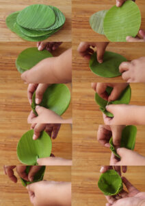 4.ตัดใบตองเป็นวงกลม เช็ดทำความสะอาดให้เรียบร้อย นำใบตอง 2 แผ่นมาวางประกบกัน ให้วางขัดลายกัน จากนั้นจับจีบทำมุม 4-5 มุม