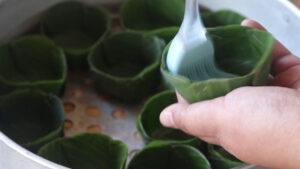 7.เทแป้งลงไปในกระทง จากนั้นนึ่งด้วยไฟกลางประมาณ 30 นาที พอนึ่งเสร็จก็พักให้เย็ยสนิท
