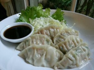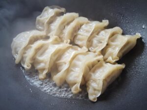 5.ตั้งกระทะเทฟล่อนใส่น้ำมันเล็กน้อยเริ่มร้อน นำเกี๊ยวลงไปทอด เมื่อก้นเริ่มเป็นสีน้ำตาลให้ใส่น้ำลงไป1/3ของเกี๊ยว ปิดฝาทิ้งไว้จนเกี๊ยวสุก