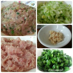 3.ผสมไก่สับ/กะหล่ำปลี/กุยช่าย/ขิงและ ซีอิ๊วขาว/น้ำมันหอย/น้ำตาลเล็กน้อย คลุกเคล้าให้เข้ากัน หมักทิ้งไว้1ชม.หรือมากกว่านั้น