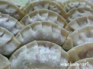 4.นำแผ่นเกี๊ยวมาใส่ไส้แล้วจับจีบห่อปิดให้สนิท
