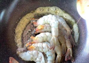 -ใส่เนยในกระทะ พอเนยละลายใส่กุ้งลงผัดค่ะ