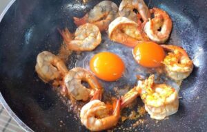 -ผัดจนกุ้งเกือบสุก ใส่ไข่ลงผัดค่ะ