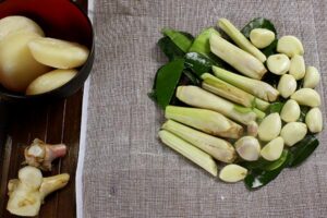 ► ห่อเครื่องต้มน้ำซุป ได้แก่ ข่า ตะไคร้ ใบมะกรูด และกระเทียม ห่อด้วยผ้าขาวบาง นำไปต้มในน้ำเดือด