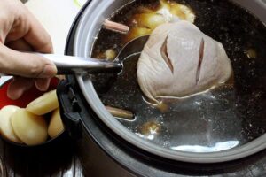 ► รอน้ำเดือดใส่สะโพกไก่ น้ำมันหอย และน้ำตาลมะพร้าว