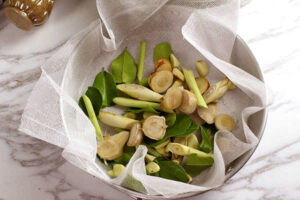 ◆ นำข่า ตะไคร้ ใบมะกรูด และกระเทียม ห่อด้วยผ้าขาวบางและนำไปต้มในน้ำเดือดจนน้ำออกสีเขียวเครื่องเทศ