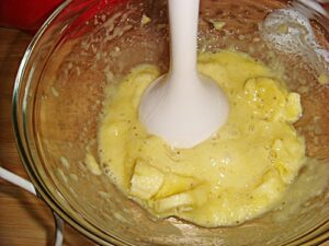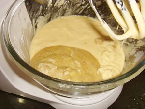 • 5. เมื่อตีเข้ากันจนได้ที่แล้ว ใส่กล้วยบดลงไปตีให้เข้ากันอีกครั้ง