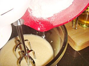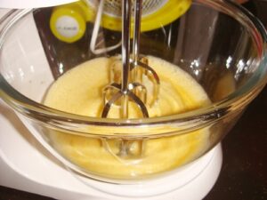 • 3. ตีไข่ น้ำตาลทราย และเกลือ ให้ขึ้นเป็นครีม
