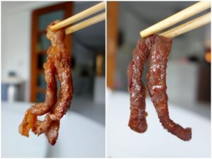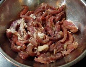 1. หั่นเนื้อวัวเป็นชิ้นยาว ๆ หมักกับน้ำปลาและพริกไทยเคล้าผสมให้เข้ากัน นำเข้าตู้เย็นหมักไว้ประมาณ 2 ชั่วโมง (เนื้อเริ่มจะแห้งเพราะในตู้