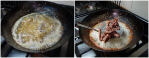2. ใส่น้ำมันพืชลงในกระทะให้เยอะพอสมควร นำขึ้นตั้งไฟแรง พอน้ำมันร้อนใส่เนื้อที่หมักไว้ลงไปทอดทีละครึ่งหนึ่ง ทอดประมาณ 9 นาที