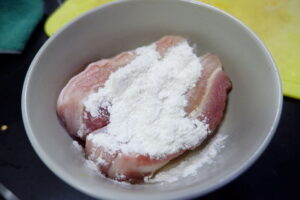 3. ก่อนทอดใส่แป้งทอดกรอบลงไป เคล้าให้ทั่วเนื้อหมู