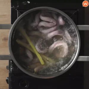 – ทุบตะไคร้ใส่ลงไปในน้ำเดือดจัด จากนั้นนำไส้อ่อนหมูลงไปต้มจนนิ่มประมาณ 30 นาที พอสุกดีแล้วค่อยนำมาตัดเป็นชิ้นพอดีคำ
