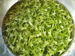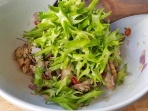 5.สลัดสะบัดน้ำออกให้หมด ใส่ถั่วพลูลงไป ใส่ใบมะกรูดซอย