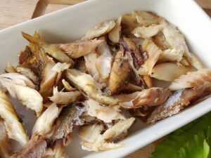 แกะเอาแต่เนื้อปลา (ต้องแกะก้างออกให้หมด) ฉีกเนื้อขนาดกำลังดี พักไว้