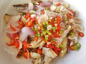 1.นำปลาทูที่แกะเนื้อใส่ในชาม ใส่หอมแดงซอย ตะไคร้ซอย พริกขี้หนูซอย