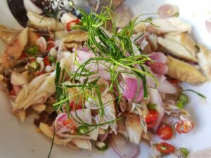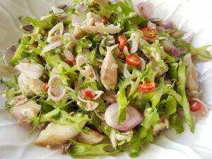 7.ปรุงรสด้วย น้ำมะนาว น้ำตาลทราย เกลือ โรยใบมะกรูดซอย