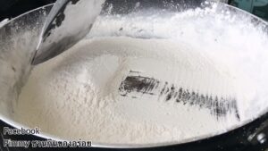 6.นำแป้งมันไปคั่วในกระทะประมาณ 10-15 นาที เพื่อทำแป้งนวล
