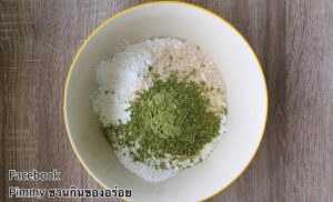 7. ผสมแป้งข้าวเหนียว แป้งข้าวโพด น้ำตาล ผงชาเขียว คนให้เข้ากัน เติมน้ำ แล้วคนผสมจนเข้ากันแป้งไม่เป็นเม็ด