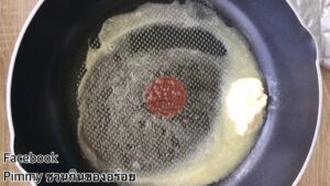 4.ตั้งกระทะไฟอ่อน ใส่เนย ผัดจนเนยละลายใส่ถั่วแดงที่ปั่นแล้วลงไป พร้อมน้ำตาล และเกลือ