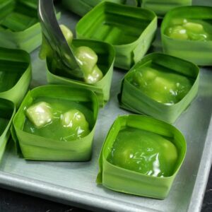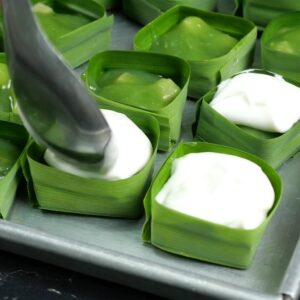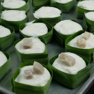 6.เมื่อทำตัวตะโก้ใบเตยเร็จแล้ว ให้นำมาหยอดลงในตัวกระทงใบเตยทันที -ตักหยอดใส่ประมาณ 3/4 ของกระทงใบเตย