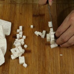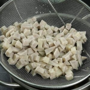 1.ตัวเผือก ปอกเปลือก หั่นเป็นลูกเต๋า ขนาดประมาณ 1 ซม*1ซม.