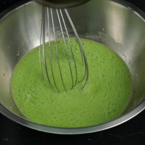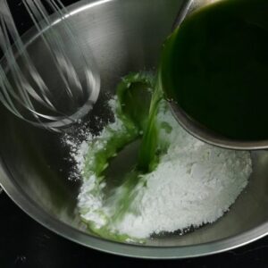 2.ค่อยเทน้ำใบเตยส่วนหนึ่งลงไป คนให้แป้งละลายจนหมด แล้วก็เทน้ำใบเตยที่เหลือลงไป