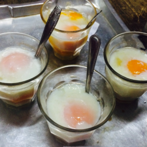 8.ตอกไข่ไส่แก้ว หรือถ้วย ที่เตรียมไว้ (ส่วนมากจะตอกใส่แก้วละ 2 ฟอง)