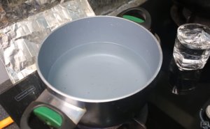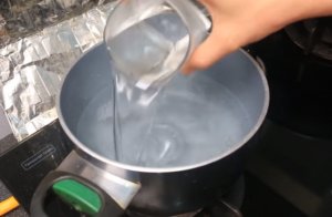 3.จากนั้นนำน้ำเย็นที่เตรียมไว้ เทลง 1 แก้ว (อย่าลืมปิดเตาก่อนนะคะ)