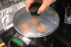 1.ตั้งหม้อ เติมน้ำให้พอท่วมฟองไข่