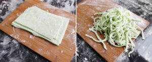 5.นำแป้งแต่ละสีมาแบ่งคลึงให้เป็นแผ่นบางๆ ตั ด ให้เป็นเส้นๆ ป้องกันเส้นติดกันด้วยการใช้แป้งมันที่แบ่งไว้โรยบางๆ ทำเหมือนกันทั้ง 3 สี