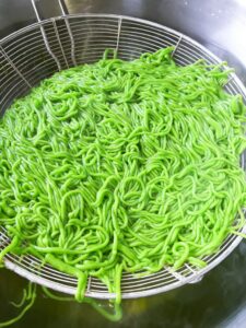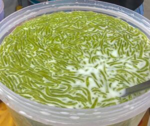 1.นำเส้นลอดช่องที่พักไว้มาใส่ลงในน้ำกะทิ